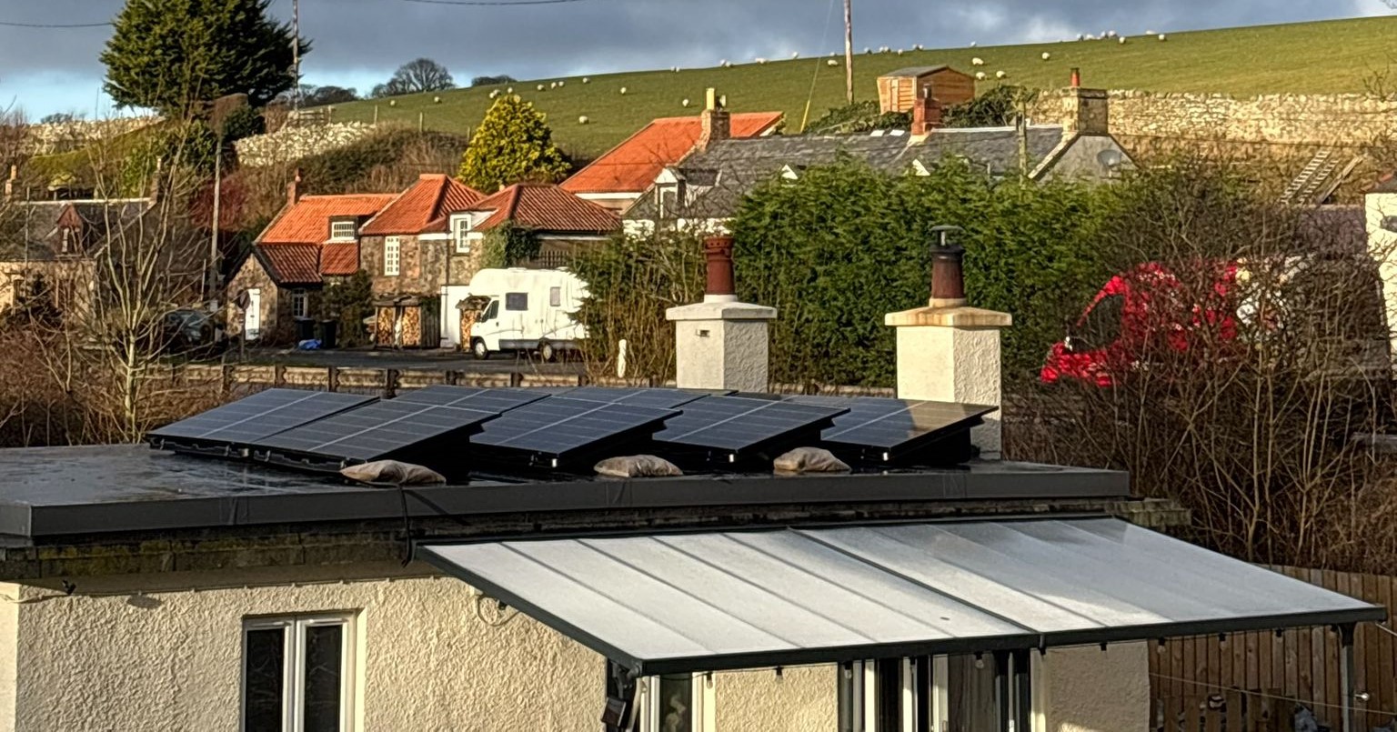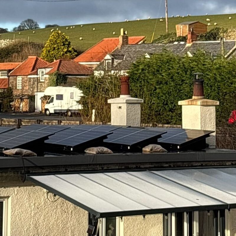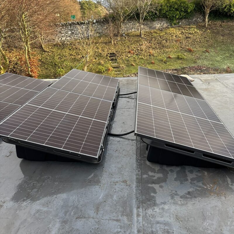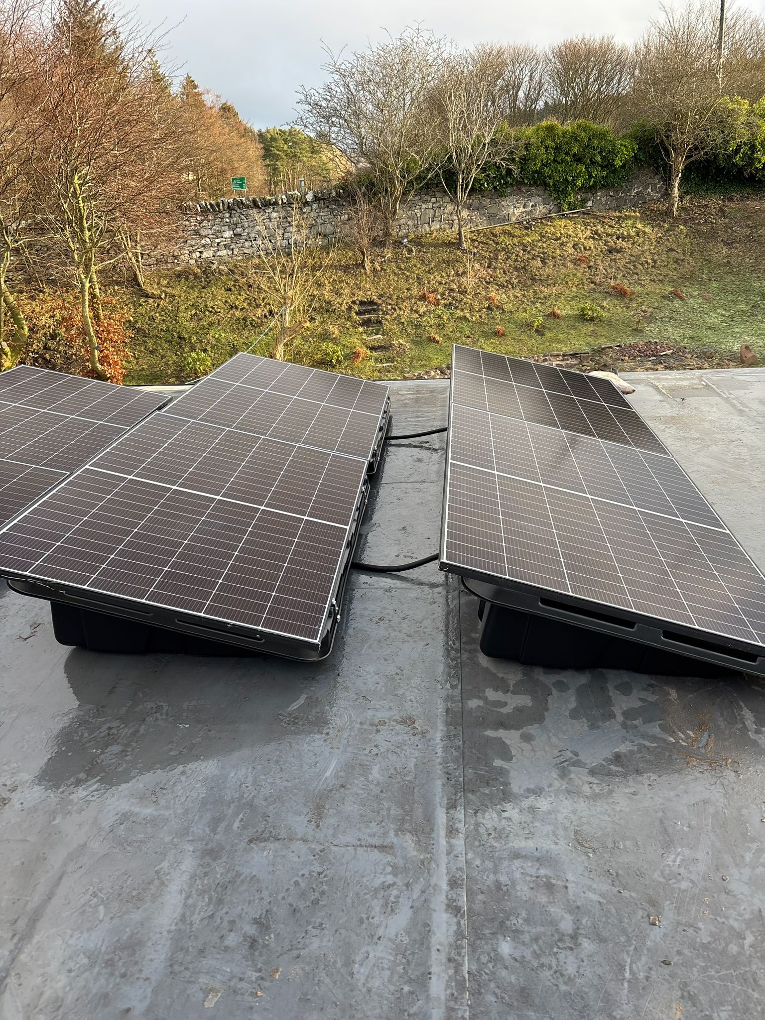 **4.45kW Solar PV System installed on a flat roof using Renusol Bucket Enclosures for south-facing alignment, maximising solar energy capture. The system features 10x 445W Trina Solar Panels and coupled with a Solax inverter for optimal performance and energy conversion.